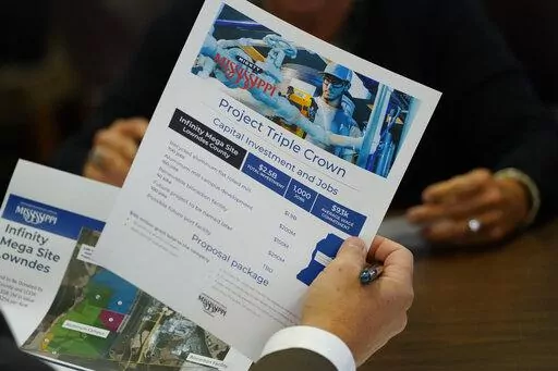 A state senator studies a $246 million in state incentives proposal for an economic development project in the northern part of the state and the aerial photograph of the Infinity Mega Site in Lowndes County that is being discussed as the potential site of a major economic development project during a Senate Appropriations Committee meeting during a special session of the Mississippi Legislature in Jackson, Miss., Wednesday, Nov. 2, 2022. (AP Photo/Rogelio V. Solis)