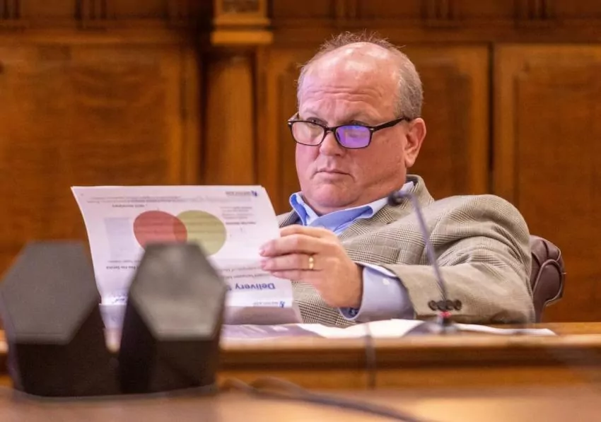 Sen. Brice Wiggins, R-Pascagoula, listens as Drew Snyder, Mississippi Division of Medicaid executive director, gives a presentation during a Senate Medicaid hearing at the state Capitol in Jackson, Miss., Wednesday, November 9, 2022. Credit: Eric Shelton/Mississippi Today