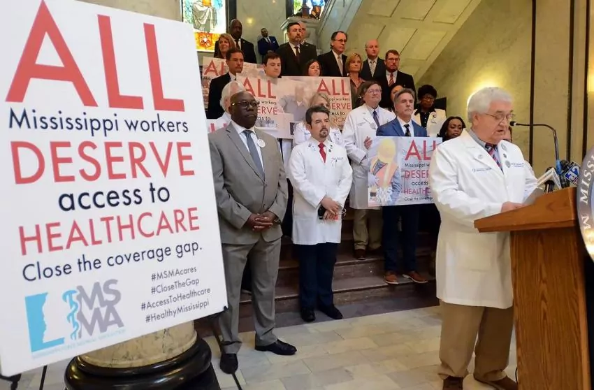 Dr. John Mitchell, Mississippi State Medical Association (MSMA) President, with physicians from across the state, endorses Medicaid expansion and closing the gap in health care coverage, during a press conference held at the State Capitol, Thursday, March 21, 2024 in Jackson. Credit: Vickie D. King/Mississippi Today