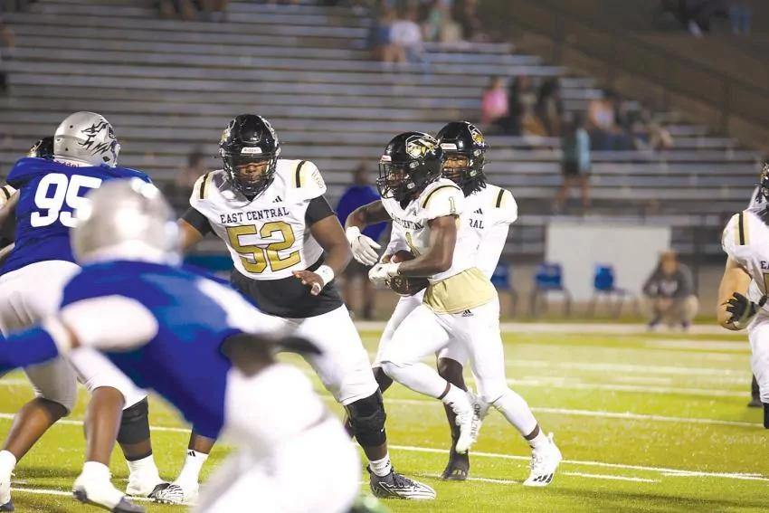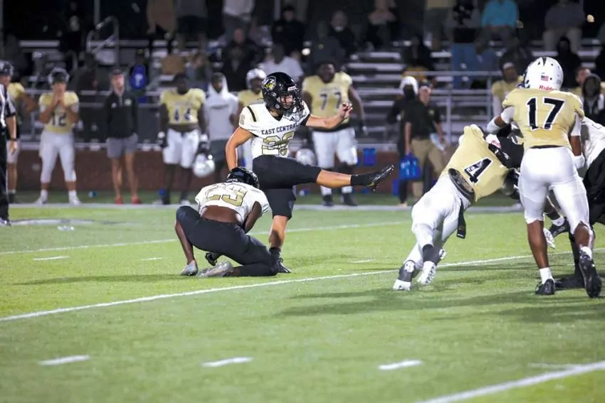 Cade Mangum of Newton County High School attempts a field goal at the end of regulation. The field goal, which may have been tipped at the line of scrimmage, sailed wide left, but he made all four extra points in the game including his attempt in overtime to give ECCC a 28-21 lead. | EC Photo