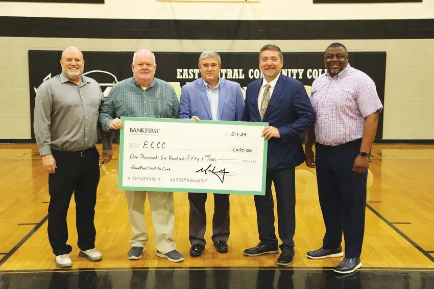 Pictured, left to right, are Paul Nixon, Director of Athletics; Joe Clay, First Vice President of Bank First; James Williams, Senior Vice President of Bank First; Dr. Brent Gregory, ECCC President; and James Miller, Vice President for Student Services.