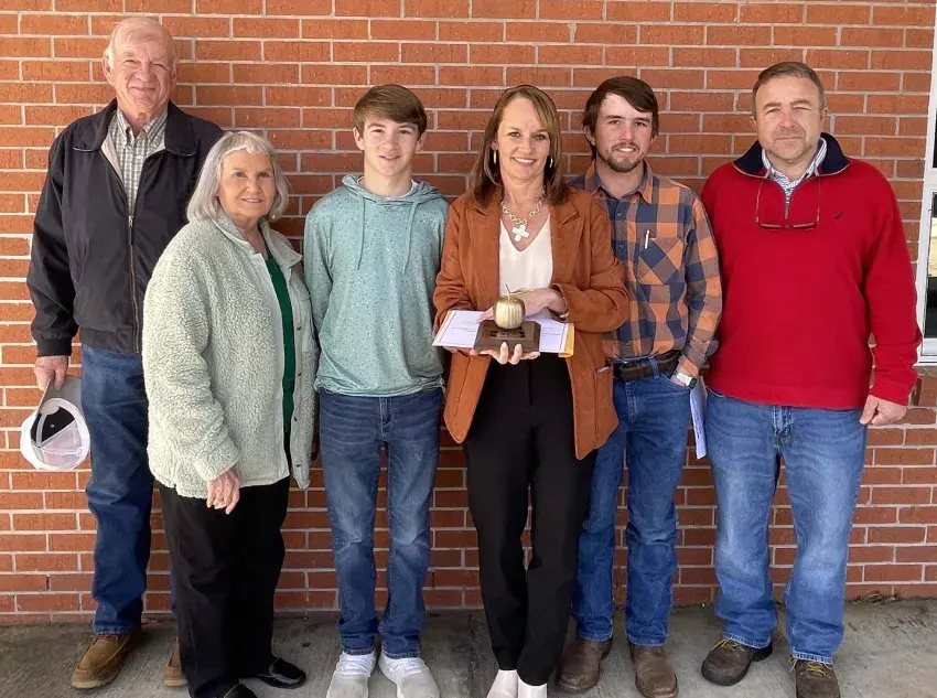 The family of Union High School Counselor Deanna Rush helped surprise her as she was given the Golden Apple award by WGBC and named their January 2025 Teacher of the Month. From left: Kenny Joe and Lisa Bankston, Luke Rush, Deanna Rush, Chandler Rush, and Hugh Rush. | Timothy Holdiness, Copyright 2025 Emmerich Newspapers, Inc.