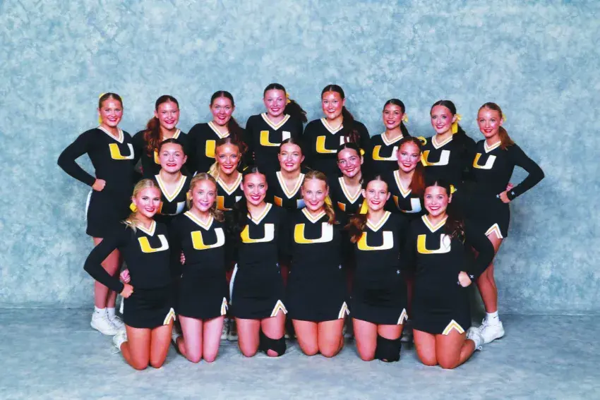 The Union High School Cheer Team, Left to Right: Top Row, Makenlee Yeager, Julia Harrison, Annley Howell, Destiny Moulds, Macie Parker, Madison Hollingsworth, Landrey Hanna, Aspen Lovern; Middle Row, Sadie Adkins, Braylee Graham, Albany Rigdon, Posey Edmondson, Rylee Pullin; Bottom Row, Lacee Bishop, Ann-Hadli Ezell, Carsyn Capps, Joely Adkins, Hannah Pullin, and Maggie Atkinson. | Courtesy of Union High School