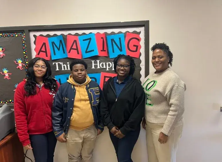 Clarksdale Municipal School District students Leah Myles, Jamarick Davis, Khloe Reed and instructor Candace Barron pose for a photograph after their last teacher preparation class before winter break, Dec. 15, 2025. Their district offers a vocational teacher preparation course at the Carl Keen Career and Technical Center. Credit: Leonardo Bevilacqua/Mississippi Today