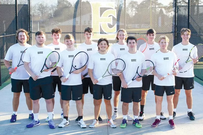 Members of the 2022 ECCC men’s tennis team include, from left, (Front) Joseph Fletcher, Luke Sanders, Ian Gordon, Zander Meeks, Garrett Crimm, (Back) Coltin Taylor, Orren Ladner, Dominik Simunovic, Steed Springfield, Samuel Turner and Kaleb Parish. | EC Photo