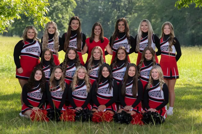 Members of the Sebastopol Cheerleading Team for 2023-2024 include Front Row; l-r: Audrey Ferguson, Keira Cannette, Kaitilin Watkins, Blayze Barnes, Harlee Wilson, Zoey McKenney; Middle Row, l-r: Kagen Wiskus, Gracie Gulledge, Abbie Wilson, Neely Wolverton, Emma Smith; Back Row, l-r: Brylee Jones, Kaylin Swindoll, Ireland Perry, Coach Brady GIlmer, Annagrace Stewart, Lauren Risher, and Jaysia Hargon. | Submitted Photo