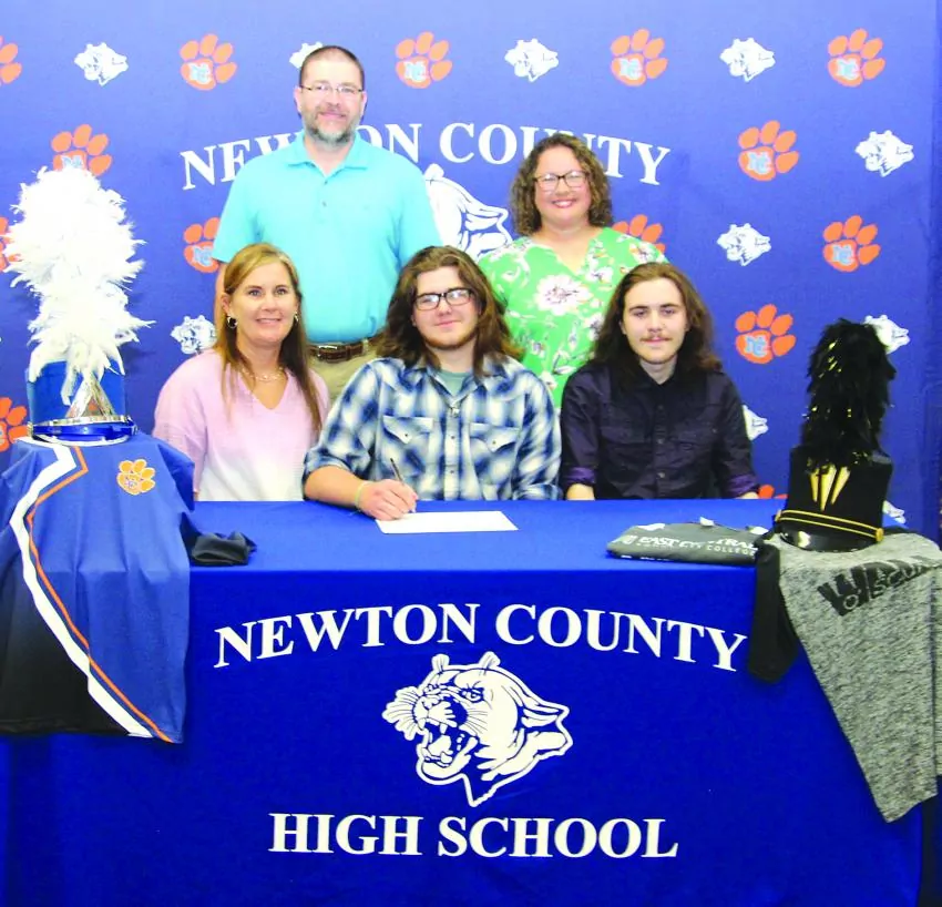 Mason Shepard, a senior at Newton County High School, will join the Wall O’ Sound of East Central Community College this fall seated from left: Christina Shepard, mother; Mason Shephard; and Austin Shepard, brother; back row from left: NCHS Assistant Band Director Phillip Pope and NCHS Band Director Stacy Sanders. | Submitted Photo