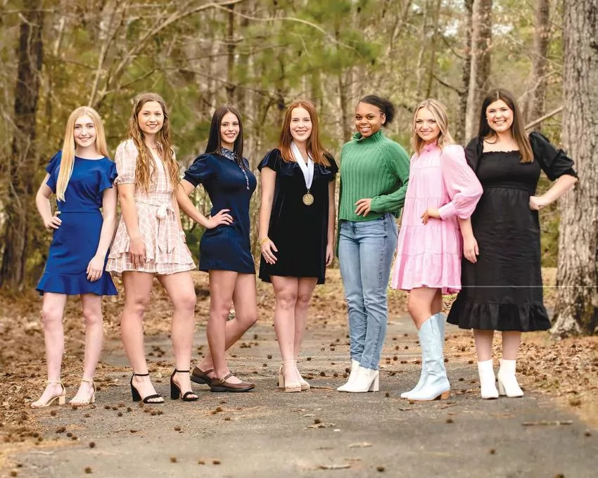 Participants in the 2024 Distinguished Young Woman Program, with current DYW, Ryann Gorgas(center), include Emily Terrell (LS), Aleah McMulan (P), Ella Clark (LS), Aaliyah Dawkins-Allen (P), Lacie Posey (P), and Olivia Embrey (LS). | Photo courtesy S.Nance photography