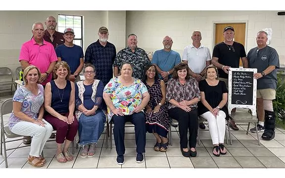 Classmates were honored to have several teachers attend including Don and Glenda Massey, Emily Luke and Dixie Adkins. Seated from left are Nancy Jo Buntyn Maples, Ann Adkins Knight, Rita Smith Watkins, Freida Bassett Foster, Mattie McDougle Slaughter, Cindy Adkins Pullin and Pam Savell Perry. Standing from left are Dale Yates, Wesley Seal, Steve Smith, Lawrence Killen, James “Buster” Powell, Don Thomas, Jim Ogletree, Kerry Winstead and Mike Price.