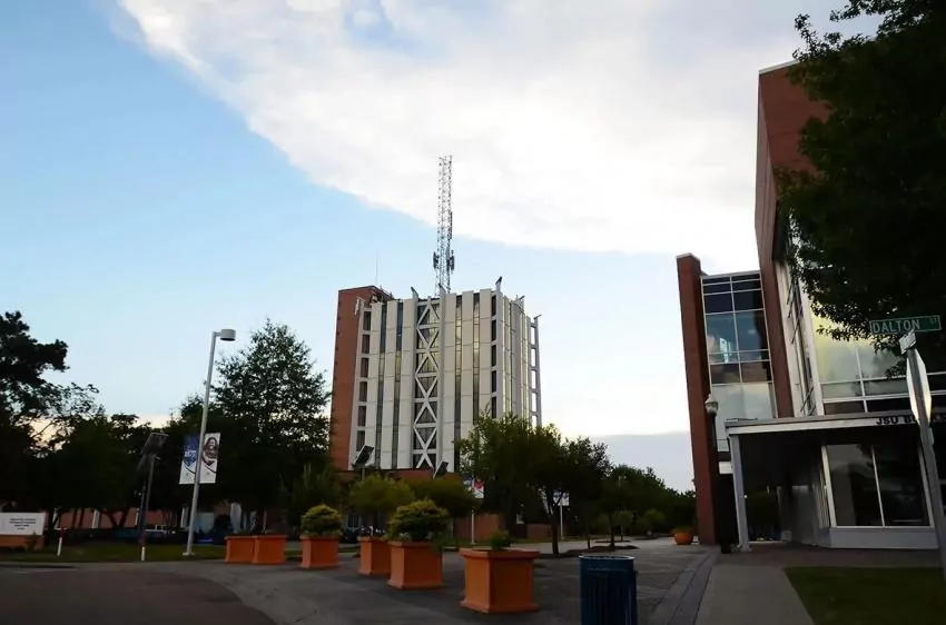 William Brown and Millard Bingham, standing with their arms crossed, are waiting in a hallway of classrooms for the executive session to end, hoping it’ll bring some information about who is going to be the next president of Jackson State University.