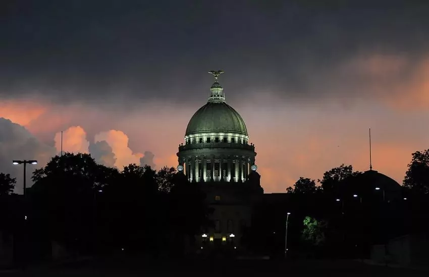 Gov. Tate Reeves shares a laugh with Rep. Nick Bain, R-Corinth, left, and Rep. Gene Newman, R-Pearl, at a bill signing Tuesday, Feb. 28, 2023, where he signed into law legislation banning gender-affirming care for trans minors. To the right, Daily Wire columnist Matt Walsh joins Sen. Joey Fillingane, R-Sumrall, in preparing for a news conference. Credit: Molly Minta/Mississippi Today