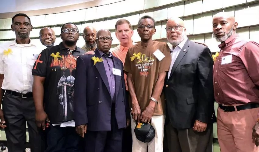 U.S.Secretary of Labor Marty Walsh (6th from left) and U.S. Rep. Bennie Thompson (second right) with Black farmers in the Delta involved in the Pitts Farm lawsuit, during a meeting at the Mississippi Center for Justice in Indianola, Thursday, June 30, 2022. Credit: Vickie D. King/Mississippi Today