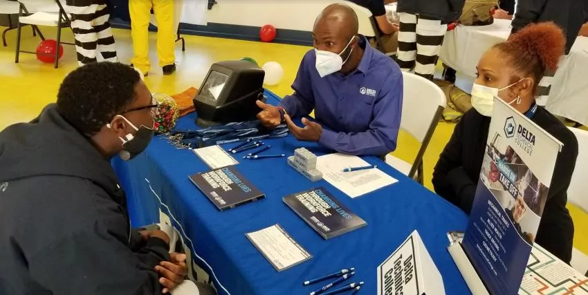 MDOC inmate Bryson West, left, discusses career and education options with Tracy Smith, center, and Cheryl Rush of Delta Technical College during a mental health resources fair held this week at the Youth Offender Unit of the Central Mississippi Correctional Facility.