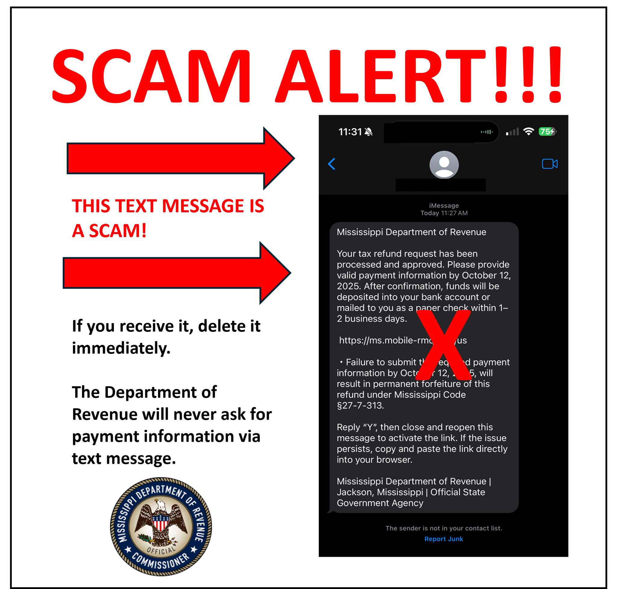 The Mississippi Department of Revenue (DOR) is warning residents about ongoing phishing scams targeting taxpayers across the state. The department has received multiple reports of fraudulent text messages claiming to be from the DOR or the Department of Motor Vehicles.
