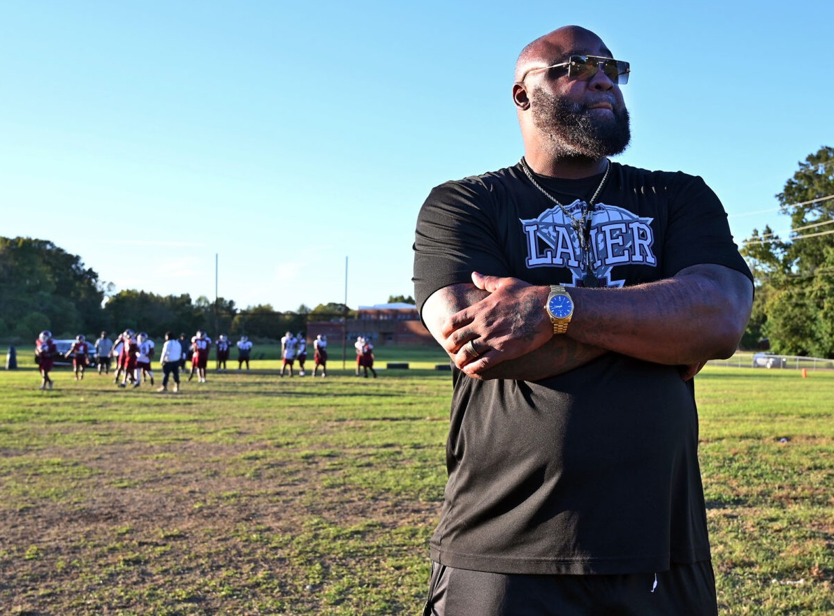 Lanier High School head football coach Tommy Kelly, center, during practice, Wednesday, Oct. 22, 2025, in Jackson. Kelly played in the NFL for Oakland Raiders, New England Patriots and Arizona Cardinals before retiring in 2014. Credit: Vickie D. King/Mississippi Today