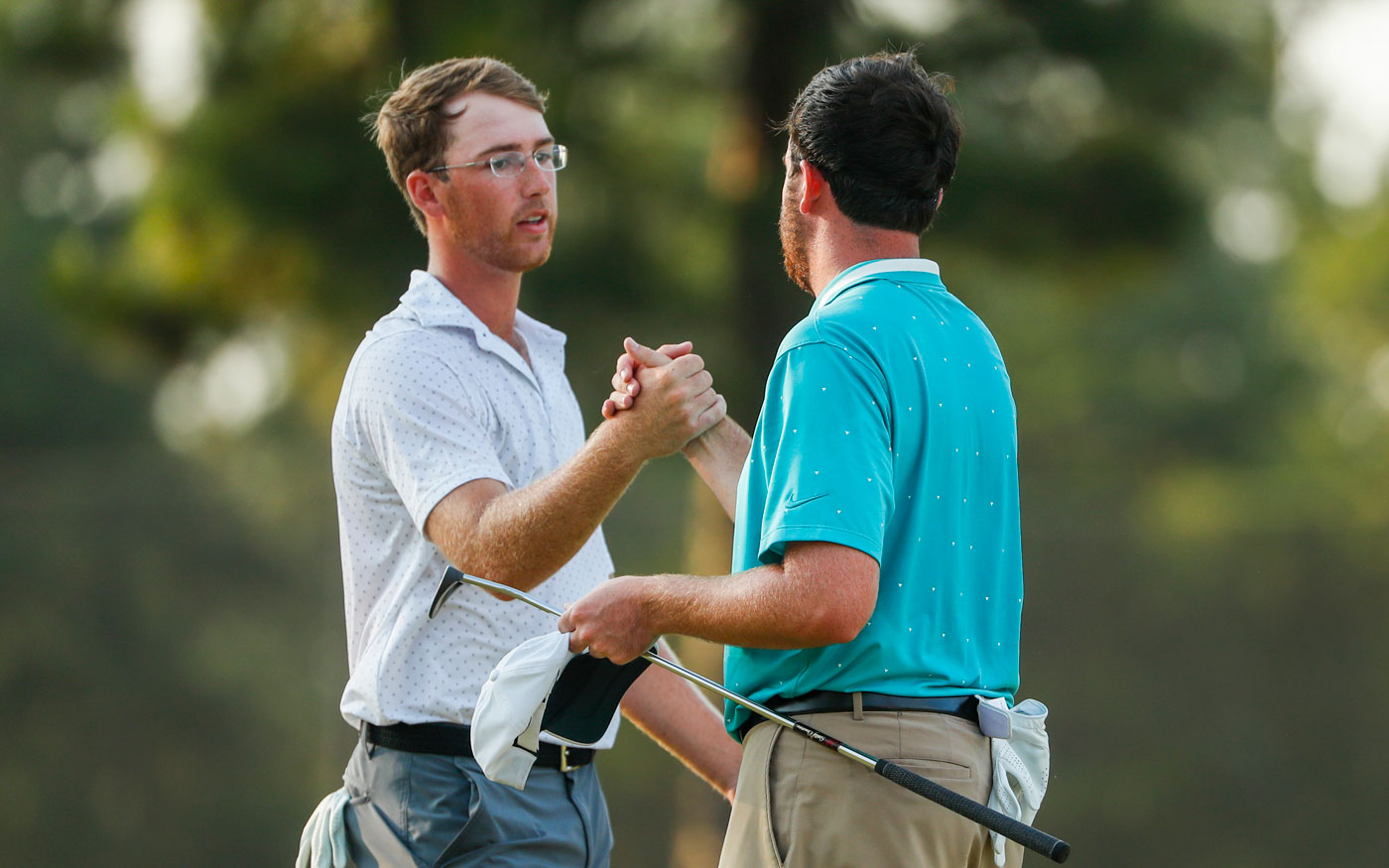 Photo caption: Andy Ogletree, left, is congratulated by Spencer Ralston after winning the match on the 13th hole during the quarterfinals at the 2019 U.S. Amateur at Pinehurst Resort & Country Club (Course No. 2) in Village of Pinehurst, N.C. on Friday, Aug. 16, 2019. (Copyright USGA/Chris Keane)