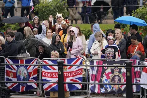 Thousands of royal fans in raincoats and umbrellas cheered, as a smattering of anti-monarchist protesters chanted “Not my king.”