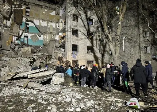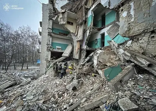 The strike by a Shahed drone in the northern Sumy region late Monday hit a dormitory of an educational facility in the town of Hlukhiv and wounded 11 others, including two children, authorities said, adding that more people could be trapped under the rubble.