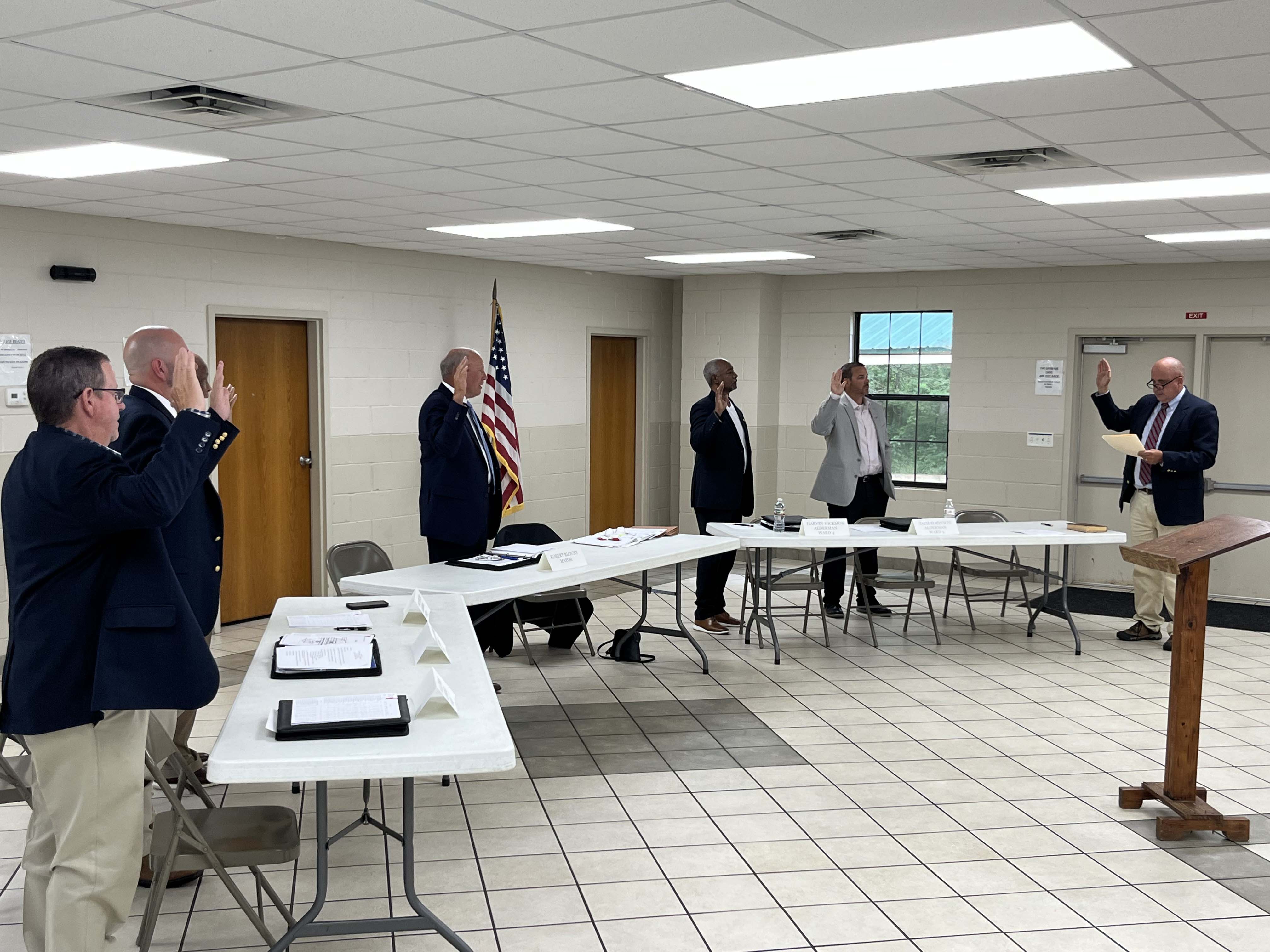 On July 2nd, the new mayor, Robert Blount, and the two new aldermen, Vince McElhenney and Zach Robinson, attended their first alderman meeting. The meeting took place shortly after the swearing-in of the new officials, a reminder to them and the public that their ultimate accountability is to God. During the alderman meeting, excitement and optimism was expressed about the new board.