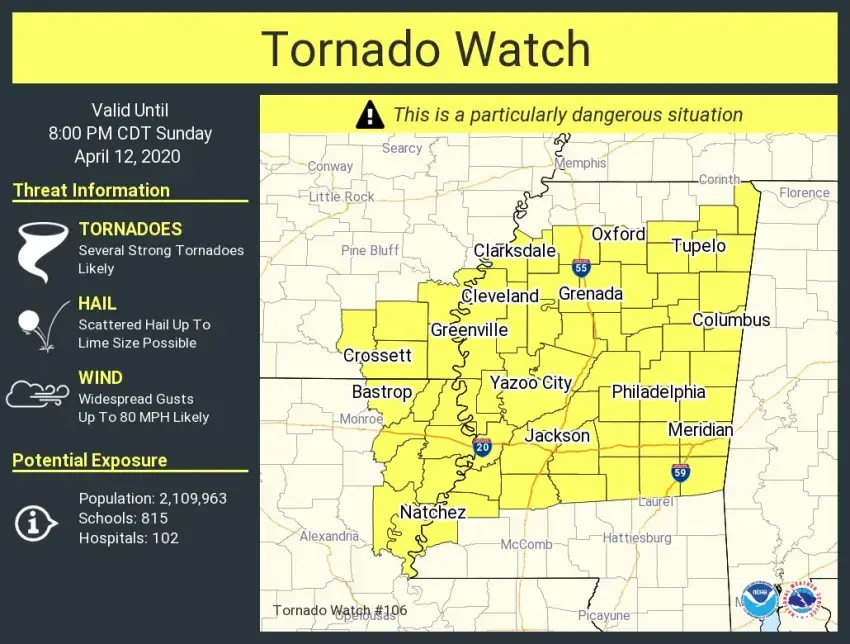 Counties in the watch area include Adams, Attala, Bolivar, Calhoun, Carroll, Chickasaw, Choctaw, Claiborne, Clarke, Clay, Coahoma, Copiah, Grenada, Hinds, Holmes, Humphreys, Issaquena, Itawamba, Jasper, Jefferson, Kemper, Lafayette, Lauderdale, Leake, Lee, Leflore, Lowndes, Madison, Monroe, Montgomery, Neshoba, Newton, Noxubee, Oktibbeha, Panola, Pontotoc, Prentiss, Quitman, Rankin, Scott, Sharkey, Simpson, Smith, Sunflower, Tallahatchie, Tishomingo, Union, Warren, Washington, Webster, Winston, Yalobusha and Yazoo.