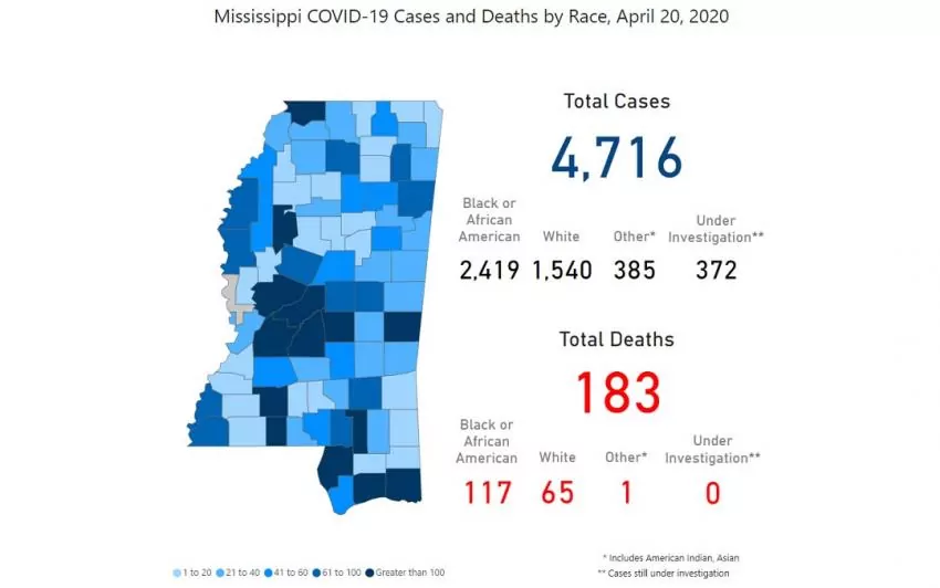 This morning MSDH is reporting 204 new cases of COVID-19 in Mississippi and 14 new deaths. The total of Mississippi’s cases since March 11 now stands at 4,716, with 183 deaths. Two new long-term care facilities have also reported COVID-19 cases.