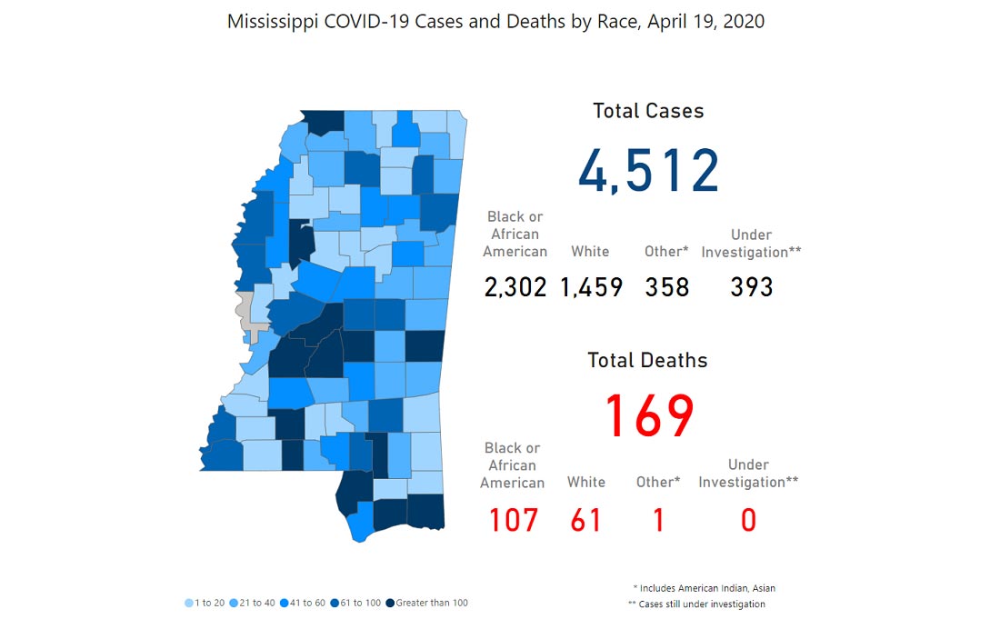 This morning MSDH is reporting 238 new cases of COVID-19 in Mississippi and 10 new deaths. The total of Mississippi’s cases since March 11 now stands at 4,512, with 169 deaths. Eight new outbreaks have been identified in long-term care facilities.