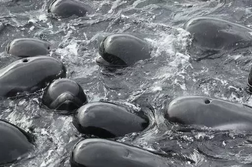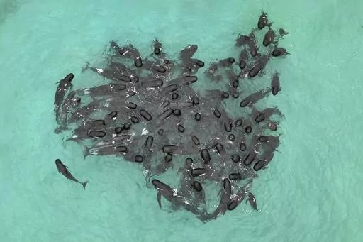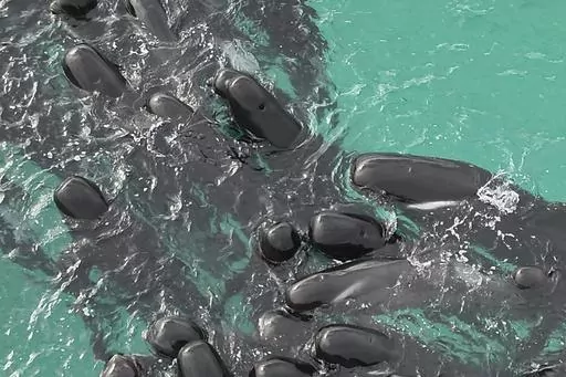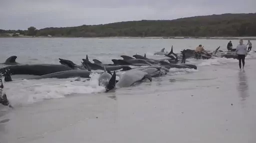 PERTH, Australia (AP) — Volunteers worked frantically on a second day Wednesday to save dozens of pilot whales that have stranded themselves on a beach in Western Australia, but more than 50 have already died.