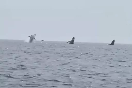 PORSTMOUTH, N.H. (AP) — A New Hampshire man celebrating his birthday on the ocean with his three daughters captured video of something so rare that even marine scientists are jealous — three humpback whales leaping from the water in near perfect unison.